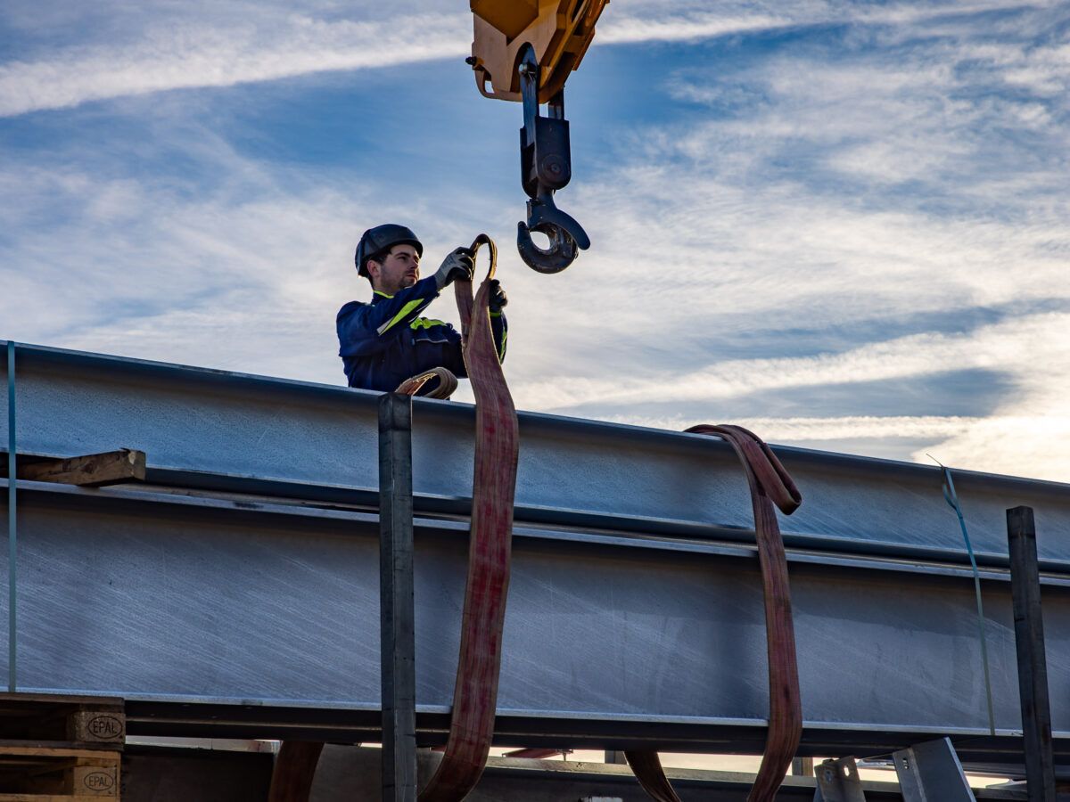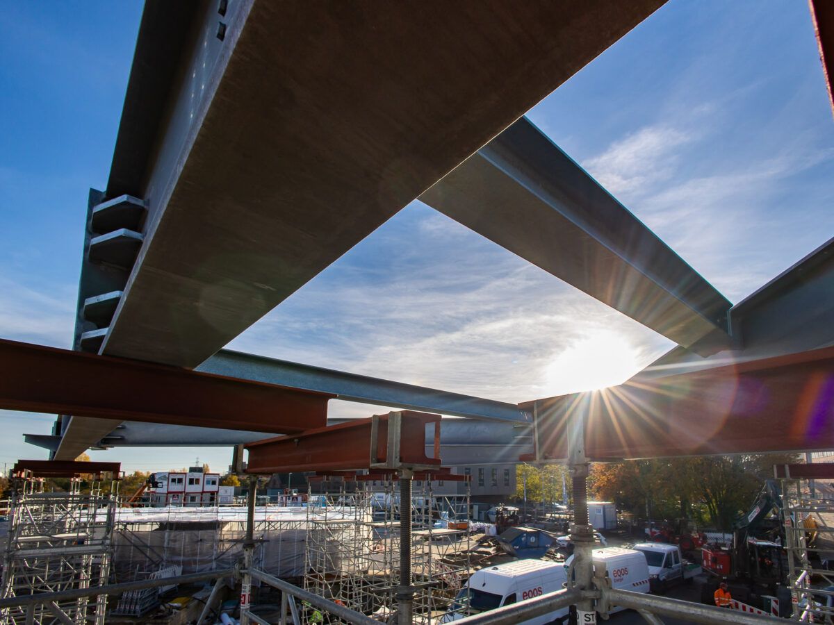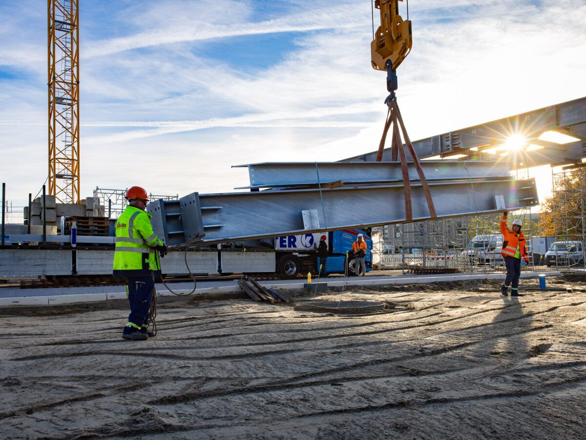 Der Blick auf die Baustelle zeigt es deutlich – der Stahlbau hat begonnen. Damit wird der Neubau des ZOB Harburg nun auch über der Erde sichtbar. Die massiven Stahlstützen, jede rund drei Tonnen schwer und bis zu 6,5 Meter hoch, bilden das tragende Gerüst für das künftige Dach. In den kommenden Monaten wächst hier das skelettartige Stahltragwerk, das später die rund 5.200 Quadratmeter große Dachkonstruktion mit Begrünung und Photovoltaikmodulen tragen wird. Zum Einsatz kommt dabei sogenannter „grüner“ Stahl – gefertigt mit deutlich geringerem CO₂-Ausstoß.